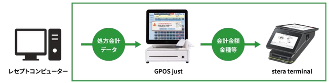 このたび、調剤薬局専用のPOSレジシステムとしてズーが提供する「GPOS just」と、三井住友カードが提供するオールインワン決済端末「stera terminal」の連動が可能となりました。今回の取り組みにより、調剤薬局で使用するレセプトコンピューターの会計情報は「GPOS just」を介して「stera terminal」に連動することができます。調剤薬局では、会計時それぞれの端末に会計情報を入力する必要がなく、作業効率化、正確性が格段に向上します。すでに「GPOS just」を導入済みの調剤薬局では、レセプトコンピューターの種別に関わらず、「stera terminal」との連動をご利用いただくことが可能です。