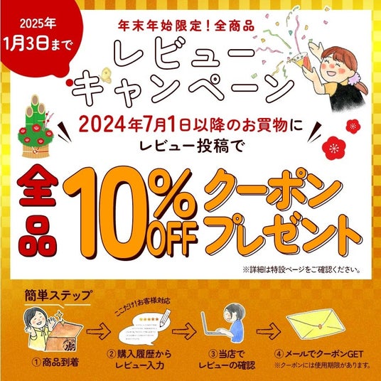 竹虎楽天店では年末年始限定!「全商品レビューキャンペーン」を2024年12月11日(水)朝10時から2025年1月3日まで開催!レビュー投稿で店内全品10%OFFクーポンをプレゼントいたします。