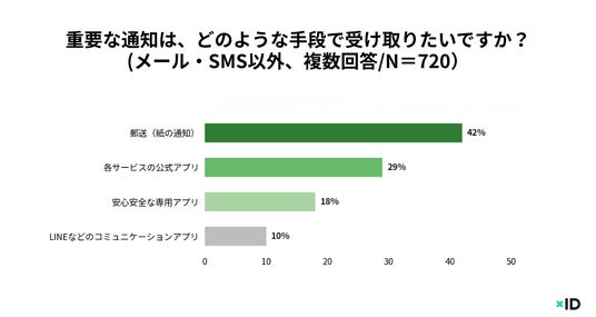 重要通知の受け取り手段としては、「郵送(42%)」が最多となり、次いで「各サービスの公式アプリ(29%)」「安全な専用アプリ(18%)」という結果となりました。