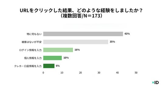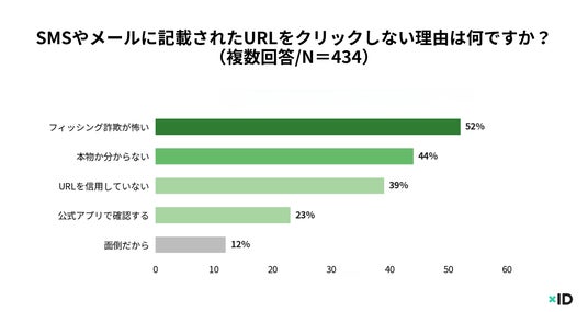 URLをクリックしない理由としては、フィッシング詐欺が怖い(52%)、本物の通知か分からない(44%)、URLを信用していない(39%)といった回答が上位を占め、正規メッセージとの判別の難しさが大きな課題となっています。