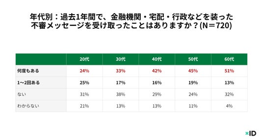 年代別では、年齢が上がるほど受信頻度が増加し、60代では「何度もある」が51%と、20代(24%)の2倍以上となりました。