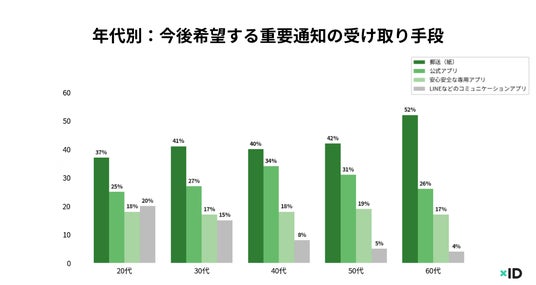年代別では、20代はコミュニケーションアプリの利用意向が比較的高い一方、60代では郵送が過半数を占めるなど、年代が上がるほど郵送志向が強まる結果となりました。