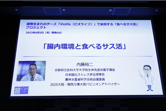 次に、京都府立医科大学大学院 医学研究科 教授 内藤裕二先生による『腸内環境と「食べるサス活」』についてのオンライン講演を実施し、内藤先生の研究テーマである「老化と腸内環境」の視点で、植物性チーズを摂ることの意味をお話いただきました。