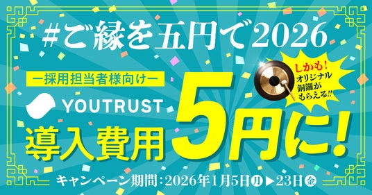 ネットワークリクルーティングサービス「YOUTRUST」を提供する株式会社YOUTRUST本社:東京都渋谷区、代表取締役社長:岩崎由夏)は、2026年も企業様と候補者様の新しいご縁を創出することを掲げ、2026年1月限定の「ご縁を五円で2026キャンペーン」を実施します。期間中にご契約いただいた企業様には、通常20万円~の導入費用を5円でご提供いたします。