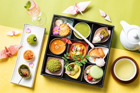 一段の升重には、抹茶のティラミスや抹茶のサブレシュークリーム、みたらし餡がアクセントの豆乳プリン、ホテルメイドの獅子柚子のジャムを使ったタルトやマカロンなど9種類の和テイストスイーツ、別皿には春ならではのサクラマスのタルトなど3種類のセイボリーが華やかさを演出。