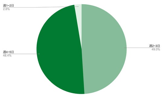 Pythonの案件における稼働日数を見ると、週2~3日の案件が49%と最も多く、次いで週4~5日の案件が48.4%とほぼ同等の割合を占めています。一方、週1日の案件は2.6%と少数派です。このデータからは、Pythonエンジニアには柔軟な働き方が提供されており、フルタイムに近い案件と週の半分程度の案件がバランスよく存在していることがわかります。これはワークライフバランスを重視するエンジニアにとって選択肢が広いことを示しています。