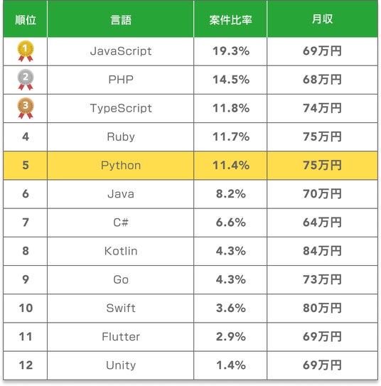 Pythonの案件はIT市場全体の11.4%を占めており、案件数ランキングでは5位にランクインしています。この数字は、Pythonがウェブ開発、データ分析、AI開発など幅広い分野で活用されている証拠と言えるでしょう。需要の高さから、Pythonスキルを持つエンジニアは継続的に案件を獲得できる可能性が高いと考えられます。