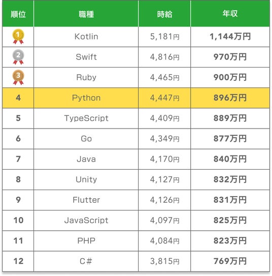 Pythonエンジニアの平均年収は896万円で、プログラミング言語の年収ランキングでは4位に位置しています。これは、Pythonスキルが市場で高く評価されていることを示しており、データサイエンスやAI開発などの成長分野での需要の高まりを反映しています。キャリアアップを目指すエンジニアにとって、Pythonは習得する価値のある言語の一つであると言えるでしょう。