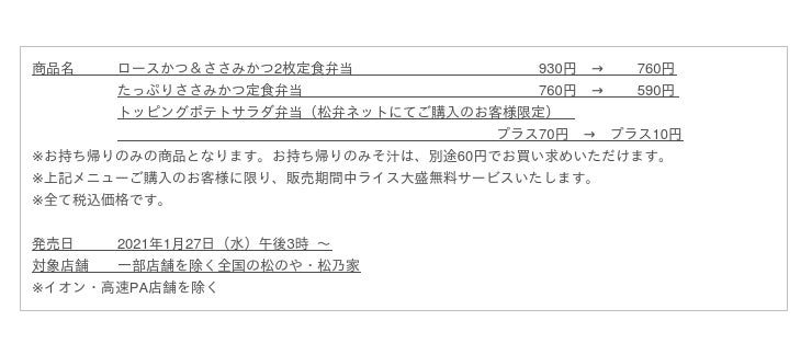 松のやのお弁当をお家でオフィスで、お得に食べよう。~1月27日(水)午後3時より開催~