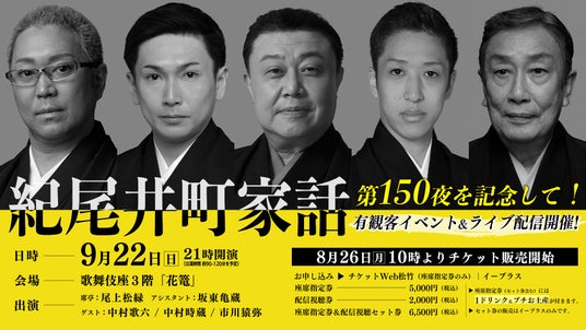 今回は、ゲストとしてこれまでの「紀尾井町家話」に出演し番組を盛り上げてきた中村歌六、中村時蔵、市川猿弥、そして番組おなじみのアシスタント・坂東亀蔵が登壇。席亭の尾上松緑とともにこれまでの配信を振り返りながら、一夜限りのスペシャルトークをお届けします。イベントの模様は生配信でもお楽しみいただけます!