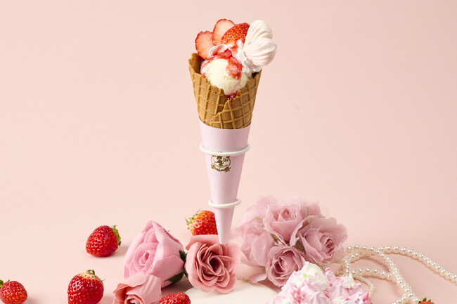 プリンセスのバスケットをイメージしたいちごサンデー。ワッフルコーンを花かごに見立てて、真っ赤ないちごが華やかに咲き誇ります。一番上にちょこんと飾られたハートのいちごメレンゲもキュート!
