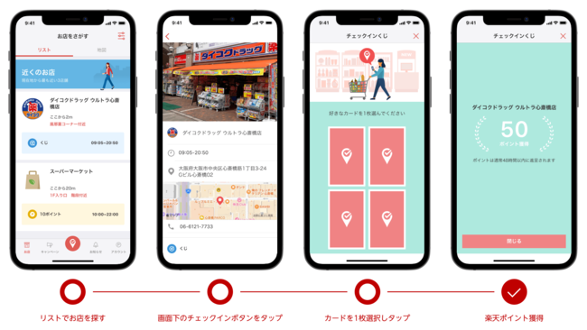 利用者は対象店舗に来店し、店内の指定エリアで「楽天チェック」アプリを起動しチェックインすると、くじ形式で「楽天ポイント」を最大50ポイント獲得することができるようになります。ダイコクは、共通ポイントサービス「楽天ポイントカード」、スマホ決済サービス「楽天ペイ(アプリ決済)」、電子マネー「楽天Edy」を導入済みのため、このたび利用可能となる「楽天チェック」を併せると、「楽天ポイント」の最大四重取りが可能となります(注)。