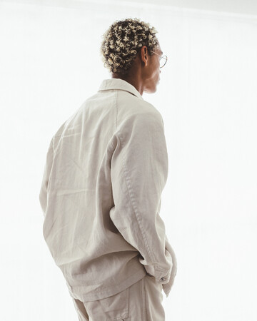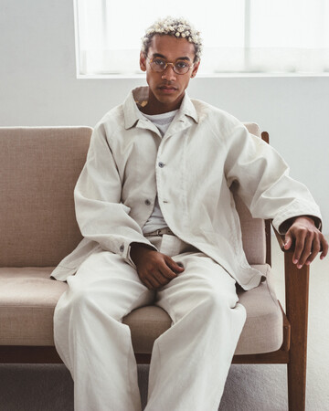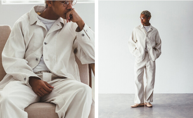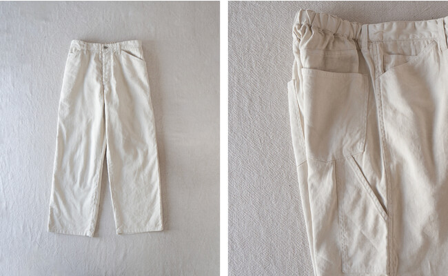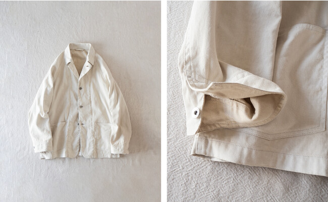 着用時には、体の動きに合わせた生地の揺れやシワ、それによる陰影が生まれ、表情豊かな顔つきに。元々のワークウェアにはない、緩みがあり、力の抜けた雰囲気が漂います。