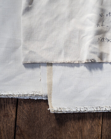 生地は、元々リネンとコットンの生成⾊を生かした織物。その表面に、ホワイト顔料を満遍なくプリントすることで、例えるならペンキで塗り立てた壁のようなファブリックでした。