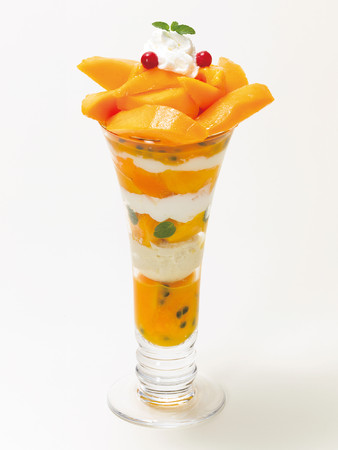 アップルマンゴーを華やかにトッピング。マンゴーソルベ、パンナコッタ、ピーカンナッツ、バニラアイスクリームを詰め込んだ、アップルマンゴーの美味しさを存分に味わえる贅沢なパフェです。
