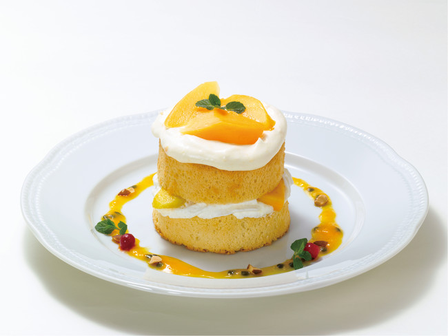 ふんわりシフォンケーキにアップルマンゴーをサンドし、パッションフルーツクリームをのせた軽やかな味わいのショートケーキです。お皿に描いたパッションフルーツソースやアーモンドなどとご一緒に。