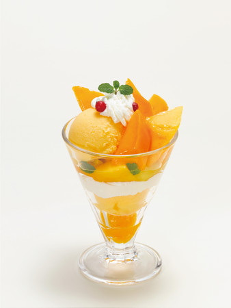 アップルマンゴーのジューシーでとろけるような濃密な香りをそのままに味わえるパフェです。マンゴーソルベとのシンプルな組み合わせをお楽しみください。