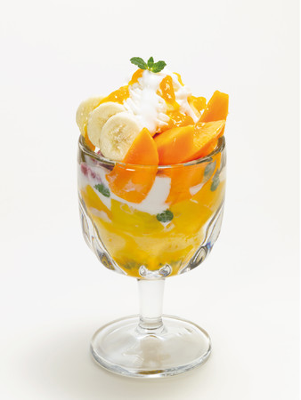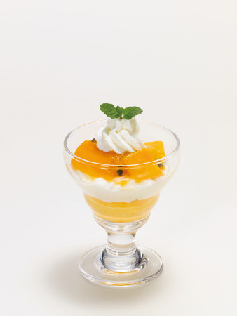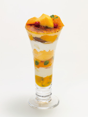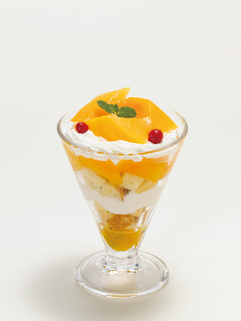 グラスの中に、アップルマンゴー、バニラアイスクリーム、ピーカンナッツ、ホイップクリーム、シフォンケーキを重ねました。キルシュ(さくらんぼのお酒)の芳醇な香りが広がります。