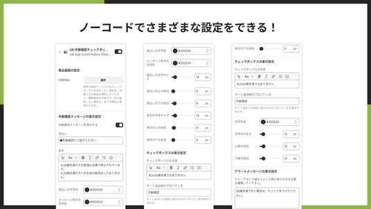 「シンプル年齢確認チェックボックスアプリ」では、年齢確認のチェックボックスのテキストやデザイン、アラート表示のカスタマイズなどの項目をノーコードでカスタマイズできます。難しい設定は必要ないので、コード編集の知識がない方でも簡単にストアに合わせて調整可能です。