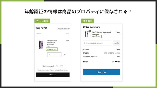 カート画面(左)と決済画面(右)の年齢確認情報の表示例