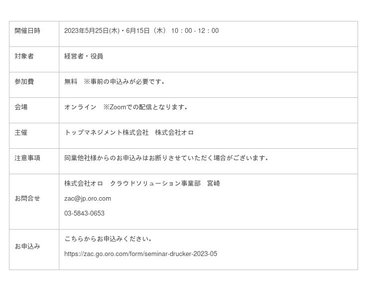 参加希望の方は、お申込みページ(https://zac.go.oro.com/form/seminar-drucker-2023-05)からお申込みください。たくさんの方々のご参加をお待ちしております。