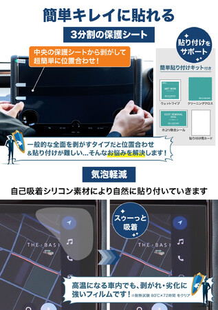保護シートを「3分割」にすることにより、大きなナビ画面でも位置合わせがしやすく、簡単に貼り付けが可能です。また、フィルムの粘着面には特殊シリコン素材を採用。これによりフィルムは自己吸着し、気泡は入りづらく抜けやすくなります。