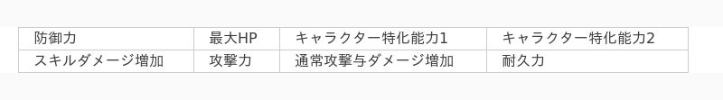 ※「キャラクター特化能力1」「キャラクター特化能力2」は、それぞれキャラクターによって異なるステータスです。