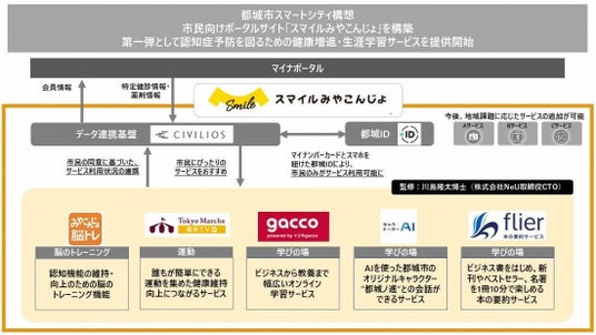 都城市では、スマートシティ構想の第1弾としてスマートシティ型データ連携基盤を構築し、2024年2月26日(月)より、当該データ連携基盤上に公開する市民ポータルサイト「スマイルみやこんじょ」を通じて、認知症予防を図るため、健康増進・生涯学習をサポートするサービスの提供を開始します。