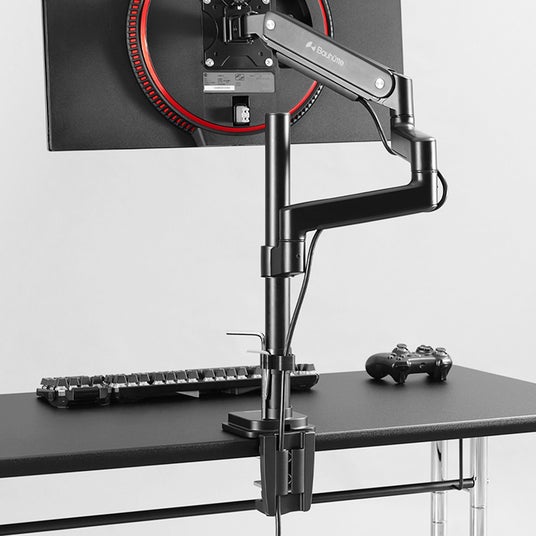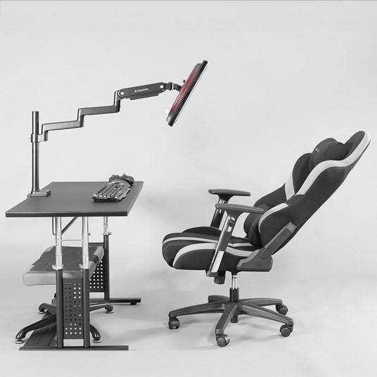 本製品の最大の特徴は、一般的なモニターアームよりも格段に長いアームです。最大約76cmまで延伸するため、座椅子やゲーミングチェアを深くリクライニングさせても、画面を顔のすぐ近くまで引き寄せることができます。デスクと身体の距離が開いても、視線と画面との距離を一定に保つことができるため、無理な姿勢になることなく、快適にゲームや動画視聴に没頭できます。