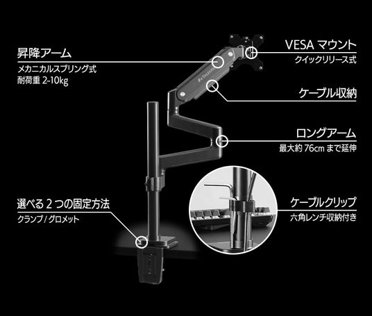 支柱に配線を沿わせられる&付属の六角レンチを差し込めるクリップ付き。アーム底面にケーブル収納スペースも確保し、美しく機能的に管理可能。