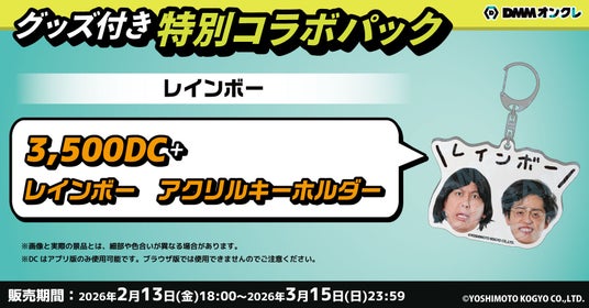 DMMオンクレのプレイに必要なDC(3,500DC)と、レインボーのお二人の顔写真を使用したアクリルキーホルダーがセットになったコラボパックを販売します。