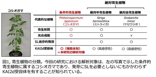 根寄生雑草は、他の植物の根に寄生し、水や養分を寄生した相手から奪いとって生育します。農業被害の報告はないものの、日本においてもヤセウツボという名前の根寄生雑草が観測されています。根寄生雑草の種子は独自の発芽システムを持っており、寄生する相手、すなわち宿主の根から分泌されるSLを感知することで発芽します。これは、宿主に寄生することなくして生育できない根寄生雑草において、極めて重要な生存戦略であると考えられます。これまで根寄生雑草においては、SL受容体として、KAI2dと名付けられた加水分解酵素ファミリータンパク質が同定されてきました。これらの受容体は、発芽にSLを必要とする根寄生植物において、低濃度のSLを感知して発芽するために重要な役割を担っていると考えられます。一方で、条件的根寄生植物であるコシオガマは、ヤセウツボなどの絶対寄生性の植物とは異なり、寄生せずに単独で生育することも可能であり、発芽にSLを必要としないことが知られています(図1)。しかしながら、コシオガマにおいてもKAI2dファミリータンパク質が存在することが報告されており、その機能に関してはほとんど明らかになっていませんでした(図1)。これらの受容体が絶対寄生性の根寄生植物におけるSL受容体と同様に、SL受容体としての機能を有しているのかどうか、また、もしSL受容能を有する場合、その受容体はどういった時にSLを認識して機能するのか、といった点に興味がもたれます。