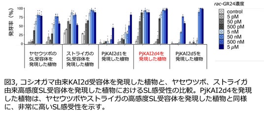 さらに本研究グループは、これらPjKAI2dが生体内においてもSL受容能を有するか否かを明らかにするために、シロイヌナズナにおいて、それぞれのPjKAI2dを発現させた組み換え体植物を作成しました。シロイヌナズナの発芽は30℃を超える高温条件では顕著に阻害されますが、SL添加によって高温による発芽阻害を回復できることが知られています。本実験系を用いて、PjKAI2dを導入した組み換え体を解析したところ、PjKAI2d1、PjKAI2d4、PjKAI2d5を導入した組み換え体種子においては、高温発芽阻害がrac-GR24の添加によって回復しました。さらに、PjKAI2d4を導入した種子においては、ピコモーラー(pM)レベルの非常に薄い濃度のSL添加によって高温発芽阻害の回復が見られたことから、本受容体は非常に高いSL感受性を有することが分かりました(図3)。この感受性は、本研究グループが、絶対寄生性根寄生雑草であるヤセウツボで同定したOmKAI2d3や、同じく絶対寄生性であるストライガから見つかっていたShHTL7が有する感受性と同程度でした(図3)。すなわち、SLを発芽に必要としないも、高感度にSLを受容する仕組みを有していることが初めて明らかになりました。
