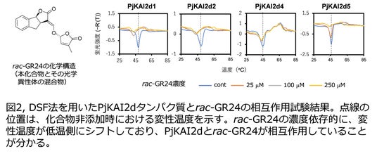 本研究グループは、コシオガマ(Phtheirospermum japonicum)において見つかっている5つのKAI2d遺伝子に着目し(PjKAi2d1-PjKAI2d5)、まずは、それらがコードするタンパク質がSL受容能を有しているか否かを調べました。実験手法としては、タンパク質の変性温度の変化を指標に低分子化合物との相互作用を評価可能なDifferential Scanning Fluorimetry(DSF)法を用いました。その結果、5つのうち少なくともPjKAI2d1, PjKAI2d4, PjKAI2d5に関しては、合成SLの一種であるrac-GR24依存的に変性温度が低下する現象が見られたことから、コシオガマのKAI2dはSLとの相互作用能を有することが明らかになりました(図2)。また、KAI2dファミリー受容体は、加水分解酵素ファミリーに属しており、既知のSL受容体は、SLに対する加水分解能を有することが知られていますが、PjKAI2d1-PjKAI2d5に関しても、蛍光性SLアナログであるヨシムラクトングリーン(YLG)に対する加水分解能を有していることが明らかになりました。