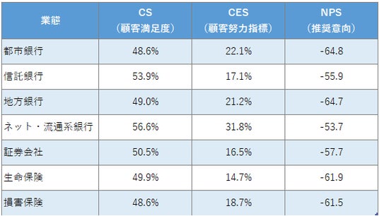 調査ではそれぞれの金融機関の利用者にCSのほか、近年ロイヤルティー指標として注目されているNPS、CES(Customer Effort Score 顧客努力指標)など多角的な項目について評価を聴取しており、評価した理由も自由記述で質問しています。