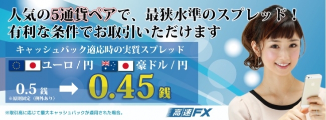 株式会社FXトレード・フィナンシャル(本社:東京都港区、代表取締役社長:鶴 泰治、以下FXトレード・フィナンシャル)は、【高速FX】でスプレッド縮小キャンペーン、および、取引量に応じたキャッシュバックキャンペーンを開催しております。5通貨ペアで業界最狹水準のスプレッドをご提供するとともに、新規建て取引量に応じたキャッシュバックを実施させて頂きます。