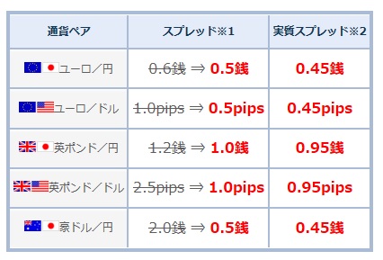 スプレッド※1は原則固定(例外あり)、実質スプレッド※2は、最大キャッシュバックが適用された場合のスプレッドです。