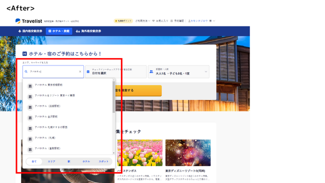 リニューアルを経てより快適に宿泊先検索ができるようになり、航空券に加えて約14,000件の国内ホテル・旅館をワンストップで比較・予約することが可能です。Travelistを通して、航空券と宿泊先を自由に組み合わせ、自分にぴったりの旅行を24時間いつでもオンラインでアレンジいただけます。