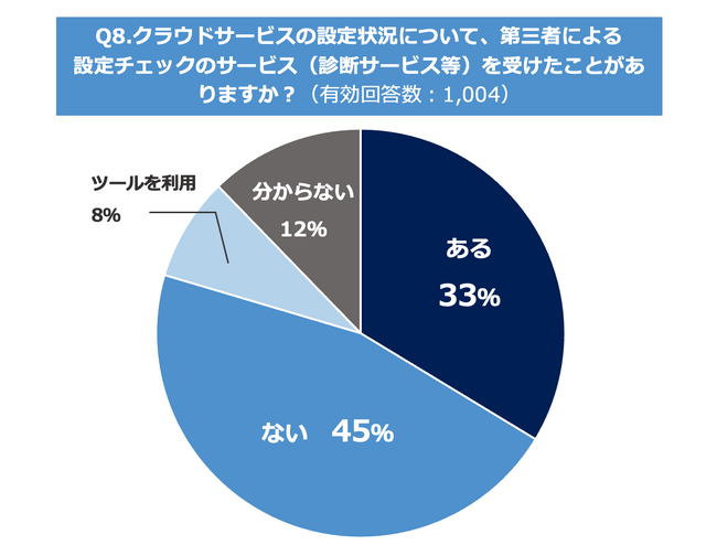 今回、「クラウドサービスの設定状況について、第三者による設定チェックのサービスを受けたことがありますか?」という質問には、「ある(33.8%)」「ない(45.3%)」「ツールを利用している(8.9%)」「分からない(12.0%)という回答結果になりました。(※図中では、数値を小数点以下切り捨てで表しています。)