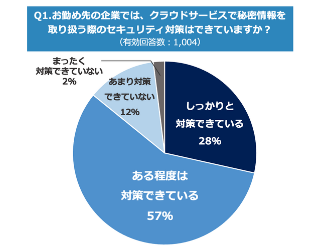 「お勤め先の企業では、クラウドサービスで秘密情報を取り扱う際のセキュリティ対策はできていますか?」という質問には、「しっかりと対策できている(28.4%)」「ある程度は対策できている(57.4%)」「あまり対策できていない(12.2%)」「まったく対策できていない(2.0%)」という回答結果になりました。(※図中では、数値を小数点以下切り捨てで表しています。)
