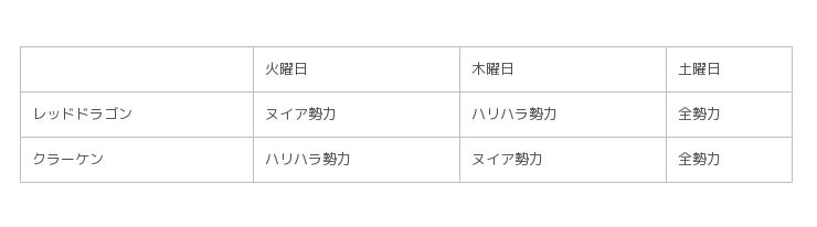 ヌイア勢力とハリハラ勢力のキャラクターは、レッドドラゴン及びクラーケンの出現エリアに、曜日によって貸切の状態で侵入できます。これにより、他勢力から妨害されることがなくレイドボス討伐のチャンスを得やすくなります。