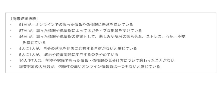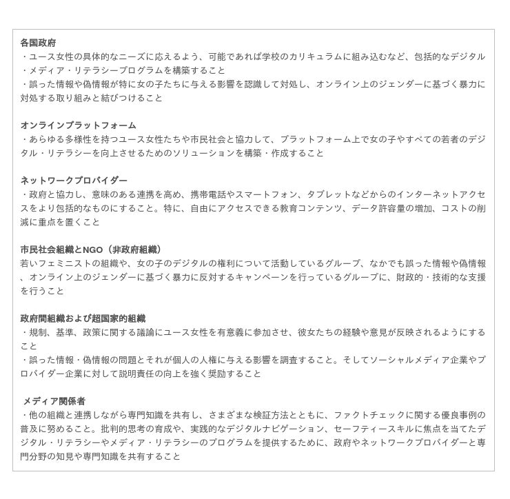 今回のレポートでは、女の子やユース女性が情報を得たり、得た情報をもとに物事を決める際に、今やインターネットやSNSが不可欠なツールとなっているにも関わらず、オンライン上には誤った情報や偽情報が溢れており、彼女たちの考えや行動に影響を及ぼす危険が高いことが明確になりました。