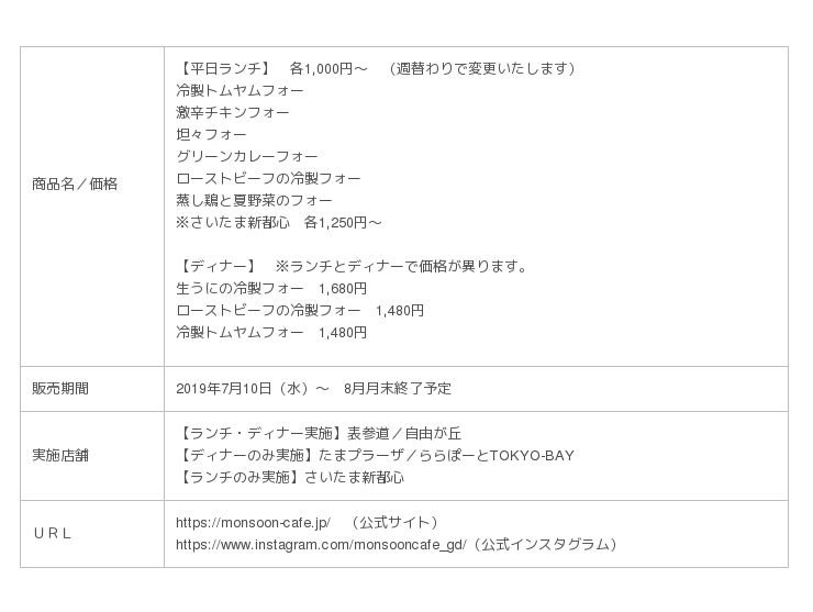 モンスーンカフェでは、表参道、自由が丘、たまプラーザ、ららぽーとTOKYO BAY「夏季限定 冷製フォー」全7種の販売を開始いたしました。