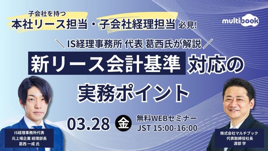 海外拠点を持つ企業の経営管理を支援するグローバルクラウドERPサービス「multibook(マルチブック)」を提供する株式会社マルチブック(東京都品川区、代表取締役社長:渡部 学)は、IS経理事務所(代表 葛西 一成 氏)と共同で、Webセミナー「親会社の決算担当者・子会社の経理担当者必見!新リース会計基準対応の実務ポイント」を開催いたします。
