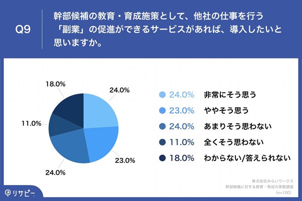 「Q9.幹部候補の教育・育成施策として、他社の仕事を行う「副業」の促進ができるサービスがあれば、導入したいと思いますか。」(n=100)と質問したところ、「非常にそう思う」が24.0%、「ややそう思う」が23.0%という回答となりました。