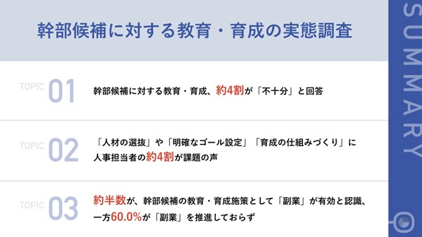 今回は、大企業(従業員数1,000名以上)の人事担当者100名に対し、幹部候補に対する教育・育成の実態調査を実施しました。