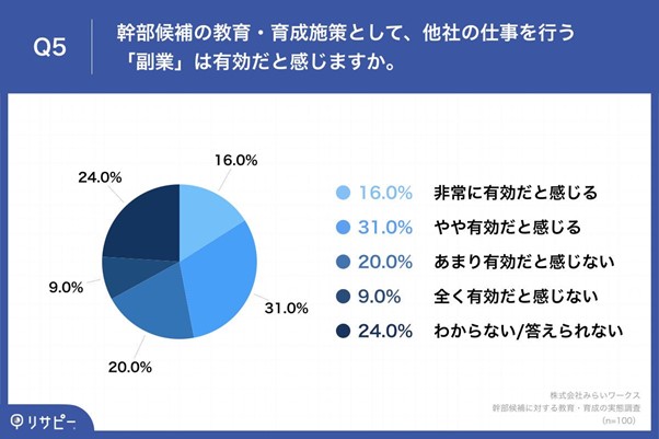 「Q5.幹部候補の教育・育成施策として、他社の仕事を行う「副業」は有効だと感じますか。」(n=100)と質問したところ、「非常に有効だと感じる」が16.0%、「やや有効だと感じる」が31.0%という回答となりました。