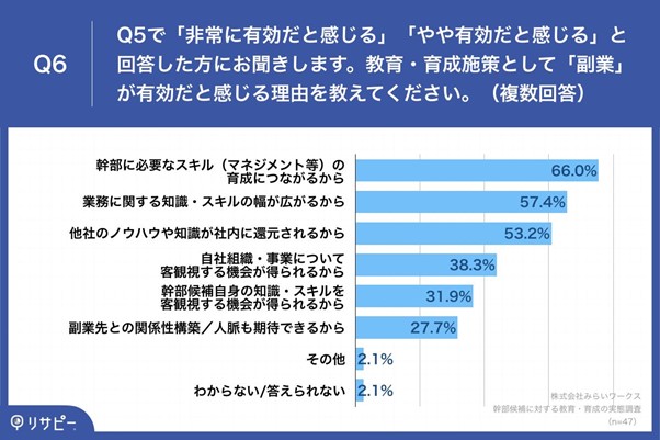 Q5で「非常に有効だと感じる」「やや有効だと感じる」と回答した方に、「Q6.教育・育成施策として「副業」が有効だと感じる理由を教えてください。(複数回答)」(n=47)と質問したところ、「幹部に必要なスキル(マネジメント等)の育成につながるから」が66.0%、「業務に関する知識・スキルの幅が広がるから」が57.4%、「他社のノウハウや知識が社内に還元されるから」が53.2%という回答となりました。