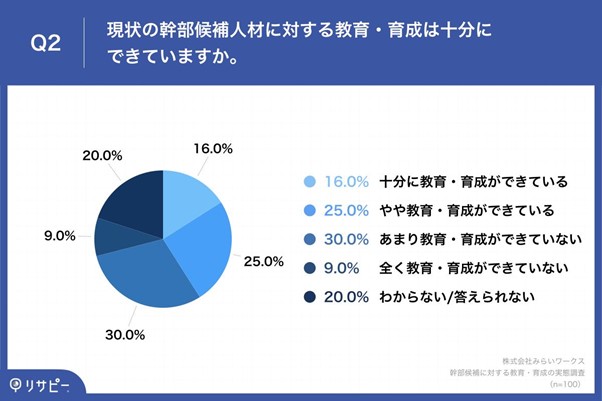「Q2.現状の幹部候補人材に対する教育・育成は十分にできていますか。」(n=100)と質問したところ、「あまり教育・育成ができていない」が30.0%、「全く教育・育成ができていない」が9.0%という回答となりました。
