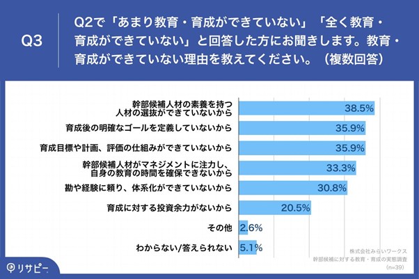 Q2で「あまり教育・育成ができていない」「全く教育・育成ができていない」と回答した方に、「Q3.教育・育成ができていない理由を教えてください。(複数回答)」(n=39)と質問したところ、「幹部候補人材の素養を持つ人材の選抜ができていないから」が38.5%、「育成後の明確なゴールを定義していないから」が35.9%、「育成目標や計画、評価の仕組みができていないから」が35.9%という回答となりました。